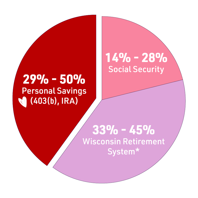 *Sources of retirement income for most Wisconsin public school employees. *The percentage of salary replaced is tied to how many years one works in state service. The 33%–45% figure assumes 25–33 years of WRS service and depends on individual circumstances. WRS covers most public employees of the State of Wisconsin as well as local government employees who elect to participate.